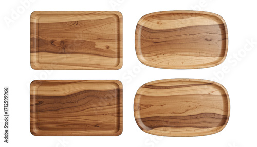 © Mithila Farzana, Naklejka premium Four Wooden Trays of Various Shapes on Black Background isolated on a transparent background