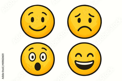 © Iryna, Fototapeta premium Four yellow emoticons displaying happiness sadness surprise joy