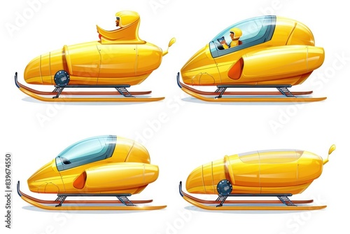 Fototapeta premium Four yellow snowmobiles sit on a clean white background, waiting to hit the...