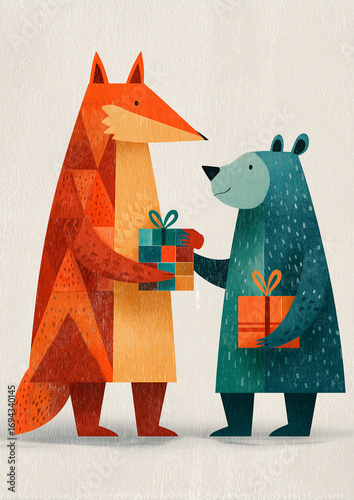 © Anna, Obraz premium Fox and Bear Exchanging Gifts