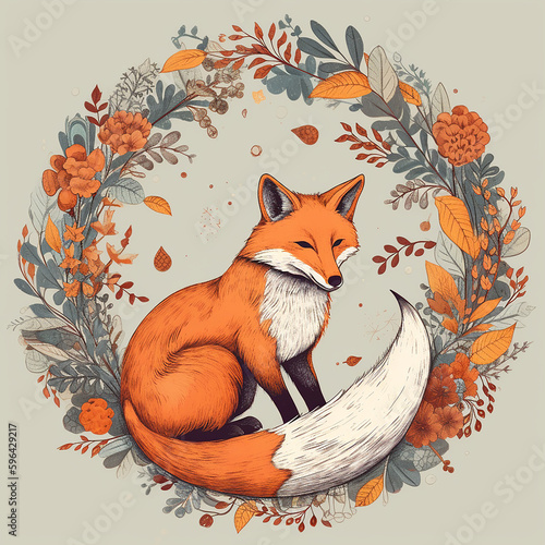 © Andre, Fototapeta premium fox and boho frame flowers
