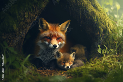Fototapeta premium Fox and her cubs resting in a lush green forest den during the morning light,...