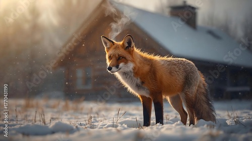 © piesuits, Fototapeta premium Fox by the Christmas Cabin