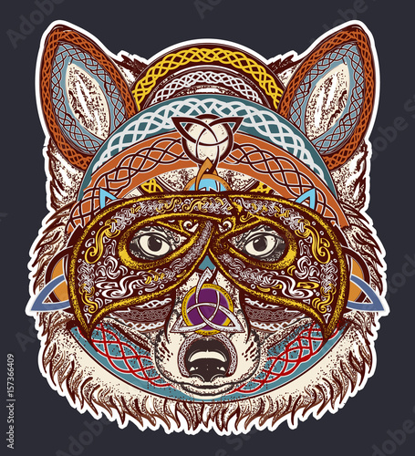 Fototapeta premium Fox color tattoo art. Fox viking in the celtic style, tattoo art. Wolf...