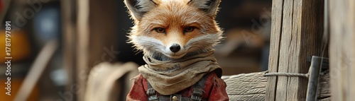 Naklejka premium Fox cub dressed as cowboy beside wooden fence, photorealistic digital clarity