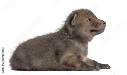 © Eric Isselée, Obraz premium Fox cub (4 weeks old) lying in front of a white background