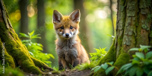 Obraz premium Fox cubs playing among the trees in a lush forest, nature, wildlife, animals,...