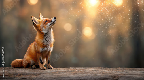© siraphol, Obraz premium fox gazes upward, surrounded by magical forest atmosphere with sparkling lights