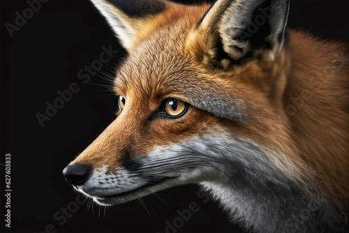© VSzili, Fototapeta premium fox head close-up on black background detail on the look. Generative AI