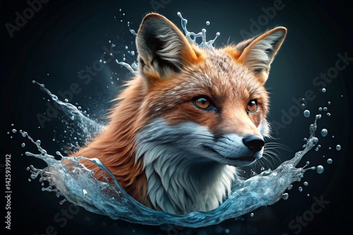 © MdIftekhar, Fototapeta premium Fox immersed in water: A captivating moment, a fox gracefully emerges from water, its orange fur gleaming against a dark, abstract backdrop, showcasing its wild elegance in this stunning illustration.