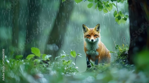 Fototapeta premium Fox in Rainy Forest Under Soft Green Light and Falling Raindrops