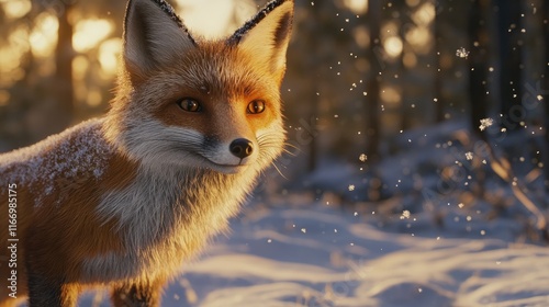 © sujitea, Fototapeta premium Fox in Winter Wonderland with Snow Falling and Forest Background