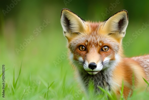 © Space Priest, Fototapeta premium Fox is standing in a green field with its head held high