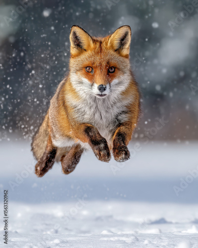 © Tim Kerkmann, Obraz premium Fox Jumping High in Snowy Landscape