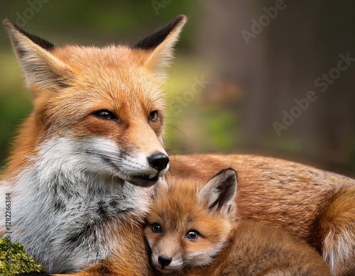 © Simon, Fototapeta premium Fox mother cuddles with her adorable cub in a serene forest setting during springtime