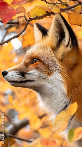 © MikeLegend, Obraz premium Fox observing surroundings among vibrant autumn leaves