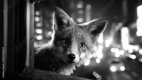 Fototapeta premium Fox Observing the Urban Night Through a Window in Dark Setting