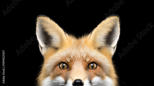 Fototapeta premium Fox Peeking: A curious red fox with piercing eyes peeks out from behind a black backdrop, creating a captivating and enigmatic portrait.