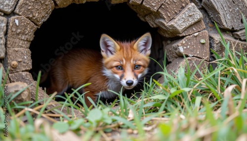 © Nattapol, Obraz premium Fox peeking out from a hollow log in grassy surroundings.