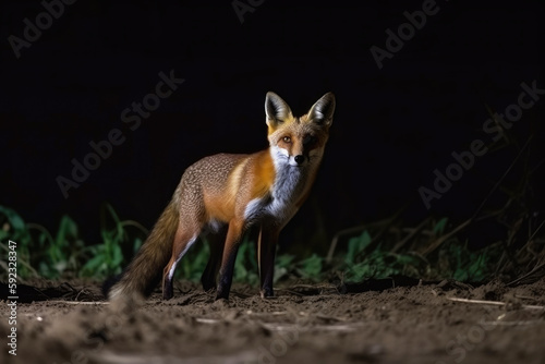 Fototapeta premium Fox preparing to hunt at night on a farm, Generative AI
