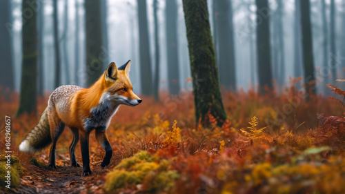 © Mo_Crafts, Fototapeta premium Fox prowls misty forest over cloudy landscape