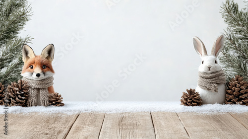 © siraphol, Naklejka premium Fox rabbit scarf pine cone winter forest holiday scene smiling animals
