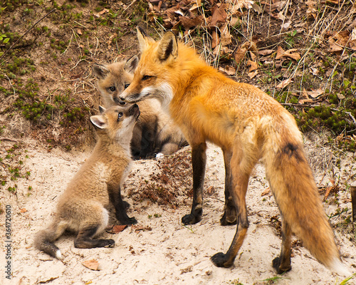 Obraz premium Fox Red Fox Stock Photo. Fox Red Fox magic moment of tenderness between mother and baby fox. Baby foxes.