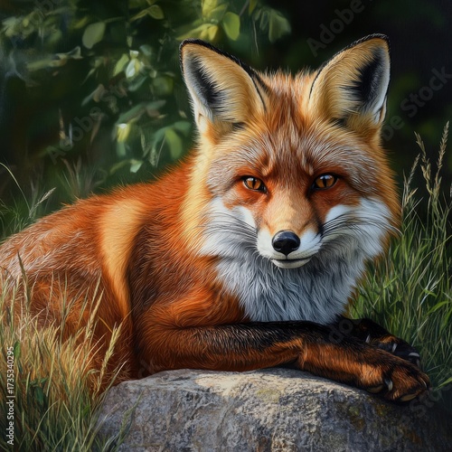 Fototapeta premium Fox resting on rock in serene forest during daytime