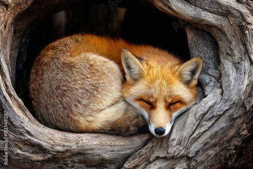 © YouraPechkin, Obraz premium Fox rests peacefully inside a tree hollow in a forest setting during daylight hours