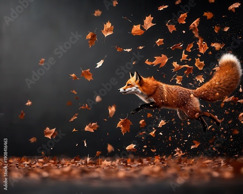© Green Creator, Fototapeta premium Fox running through falling leaves, autumn digital nature scene