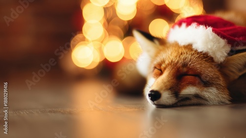 © tashechka, Obraz premium Fox sleeps by festive lights during winter season