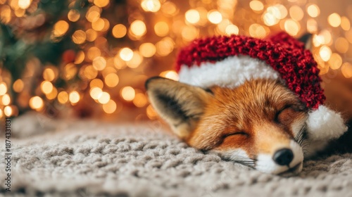 Fototapeta premium Fox sleeps with a Santa hat on a cozy blanket near Christmas lights