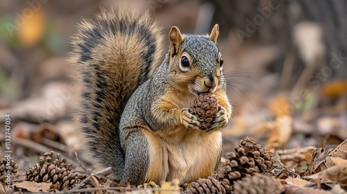 © siyons, Fototapeta premium Fox Squirrel Eating Pine Cone In Autumn Woods