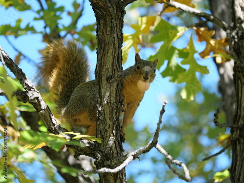 Obraz premium Fox Squirrel (Sciurus niger) Holding Bur Oak (Quercus macrocarpa) Acorn in Autumn, Colorado