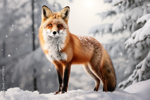 © venusvi, Fototapeta premium Fox standing alert in a snow-covered forest, embodying wild animals in winter