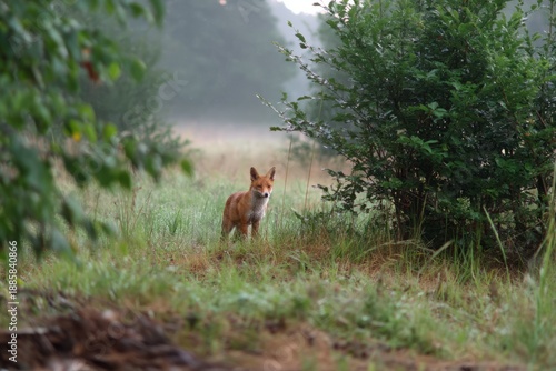 © vectorizer88, Fototapeta premium Fox Standing Quietly in a Misty Morning Forest Habitat Surrounded by Fog
