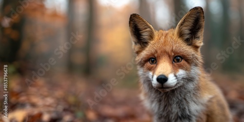 © fotofabrika, Fototapeta premium Fox stands in forest during autumn with orange and brown leaves surrounding it