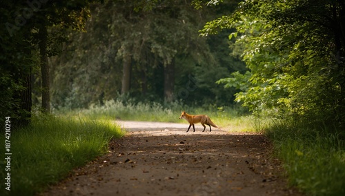 © vxnaghiyev, Fototapeta premium Fox traversing a paved park pathway, highlighting urban wildlife activity
