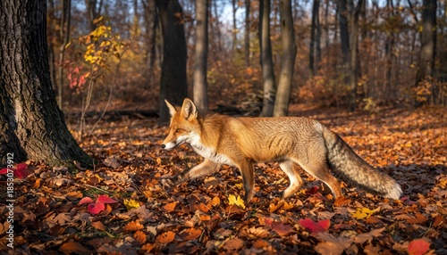 Obraz premium Fox Walking Through Autumn Forest with Orange Leaves on Ground