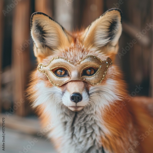 © Mary_muis/stoker ua, Fototapeta premium fox wearing an elegant gold mask, adding a touch of fantasy and charm to the scene, set against a rustic backdrop