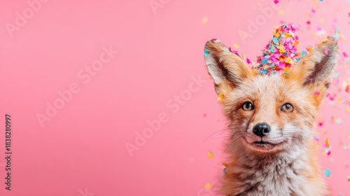 © tashechka, Obraz premium Fox with confetti on its head against a pink background creates a fun scene