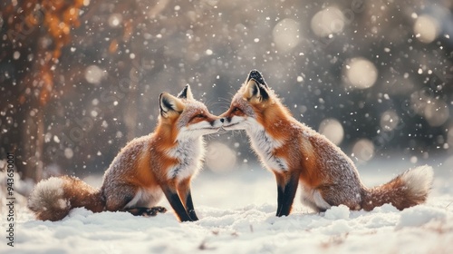 Fototapeta premium Foxes playing in the snow during a winter holiday, their fur dusted with soft...