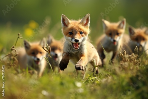 © OhmArt, Fototapeta premium Foxes pouncing on mice in a grassy field.