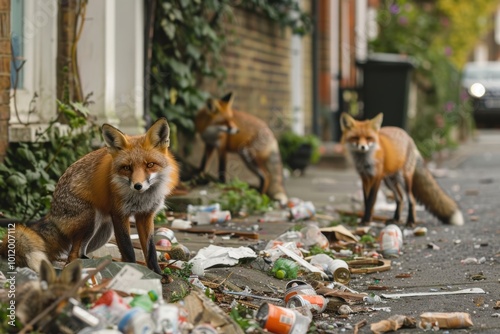 Fototapeta premium Foxes rummaging through trash in front of traditional English houses at night..