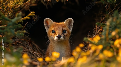 © ALIF JATI KUSUMA, Fototapeta premium Foxy cub peeking from burrow in wildflowers
