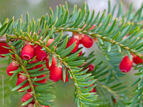 © M. Schuppich, Obraz premium Früchte der Eibe in einer Nahaufnahme