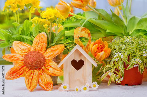© Floydine, Fototapeta premium Fröhliche Dekoration mit Nistkasten zu Ostern