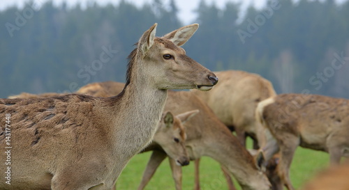© Grubärin, Fototapeta premium Frühling im Rehrudel, weibliches Rotwild im Profil