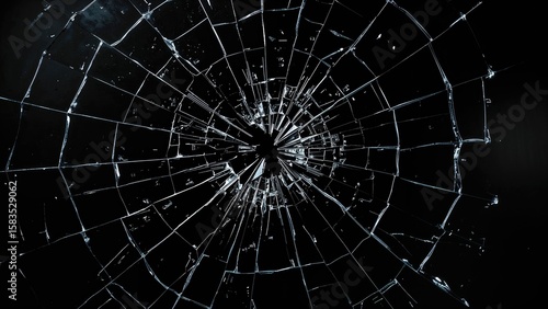 Fototapeta premium Fractured black glass with shattered hole, abstract damage design