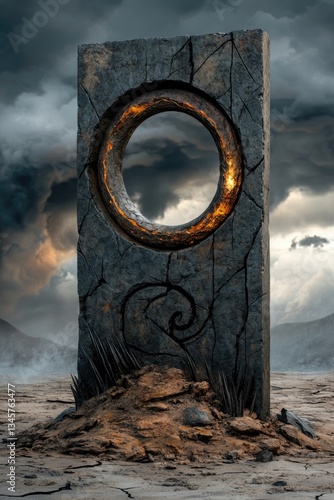 Fototapeta premium Fractured ground with glowing rune and mystical symbols beneath dark clouds in a harsh and deserted fantasy world marked by scorched terrain and a dramatic atmosphere.